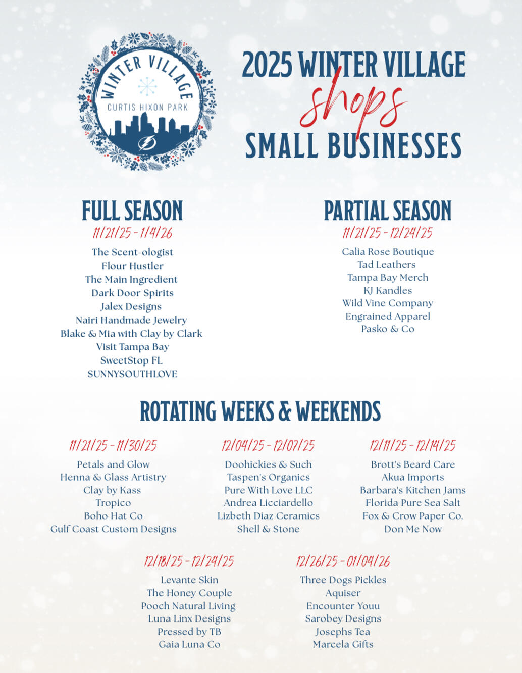 The Shops at Winter Village, delivered by PODS® Moving and Storage, were selected in Spring 2025. Please check back during Spring of 2026 for applications for next year's Winter Village shops.